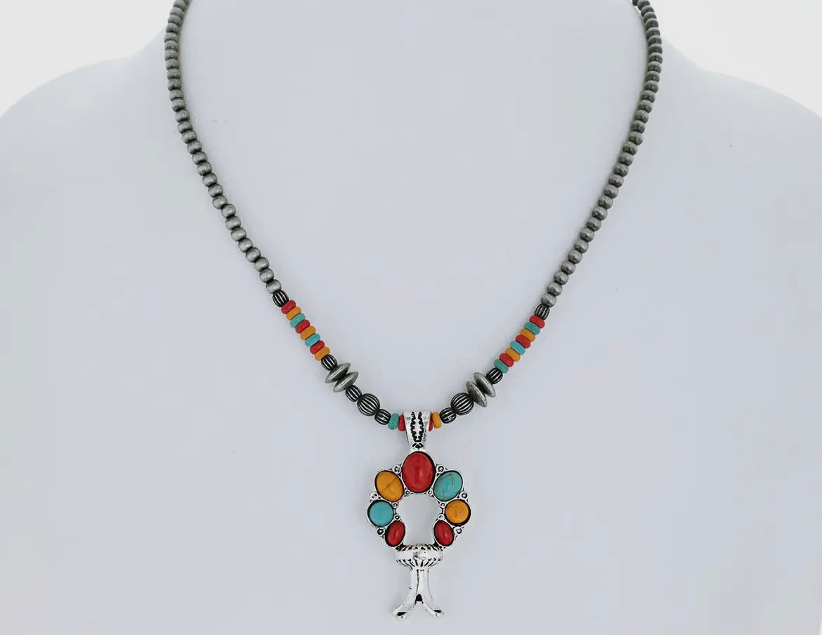 The Kori Pendant necklace is a stunning piece inspired by navajo craftmanship and western style. This necklace features a beautiful squash blossom with semi -precious stones and Navajo Beads.